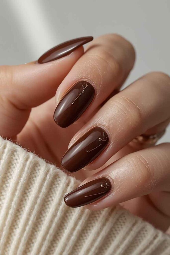 Chocolate brown nails offer a cozy, earthy aesthetic perfect for the season. This versatile shade complements neutral outfits and pairs beautifully with autumn-inspired nail art, including leaves or plaid patterns. Brown nails bring warmth and sophistication to any fall look.