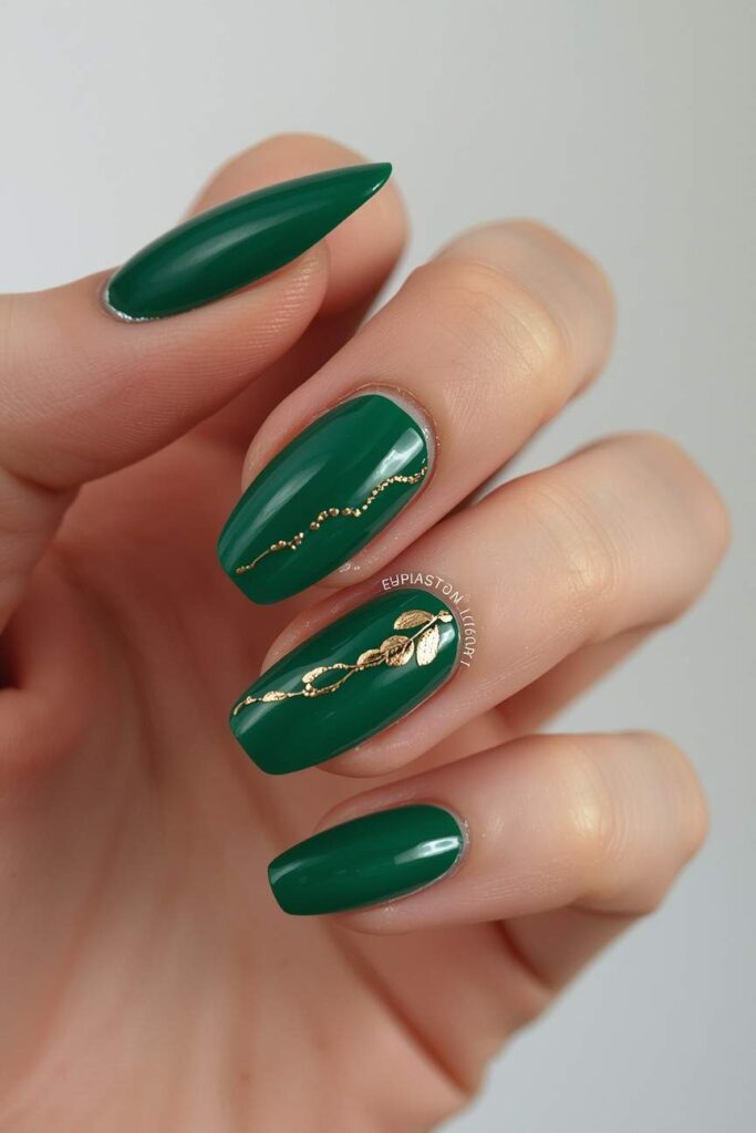 Deep forest green nails reflect the earthy tones of autumn. This rich color works well with gold or bronze accents for a chic, cozy look. Forest green nails are ideal for both casual and formal fall events.