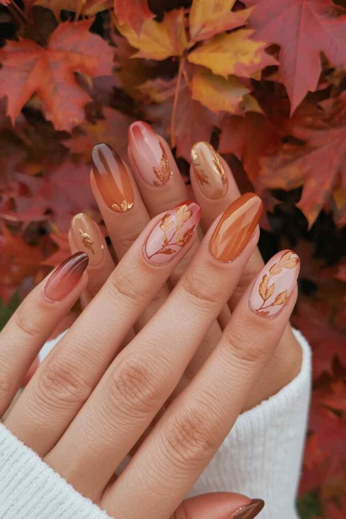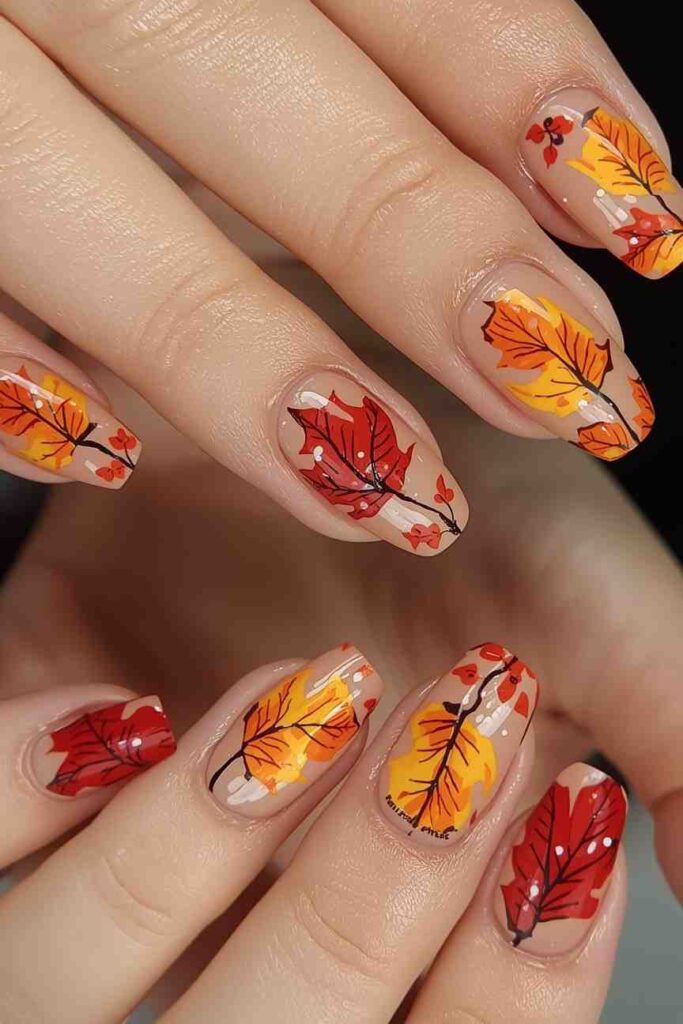Adding tiny maple leaf designs to your nails creates a festive and seasonal look. Using shades of red, orange, and gold enhances the autumn feel. This manicure is perfect for those who love creative yet elegant fall designs.