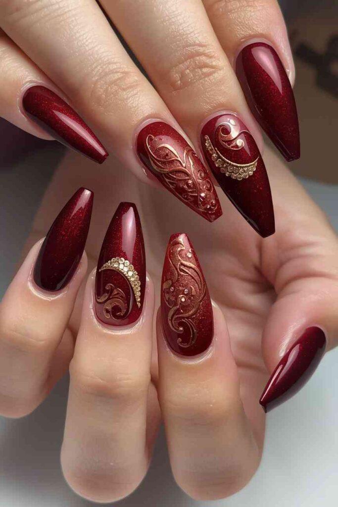 Maroon nails paired with copper accents bring richness and sophistication to fall nail designs. Metallic copper details, foil, or glitter provide a polished and stylish look, perfect for cozy autumn gatherings or formal events.
