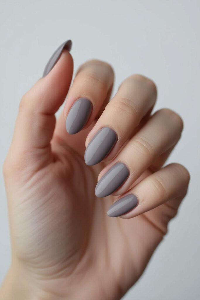 Muted grey nails offer a neutral, cozy alternative for fall. This understated shade pairs beautifully with glitter, metallics, or autumn-inspired nail art, giving a chic and modern seasonal manicure.