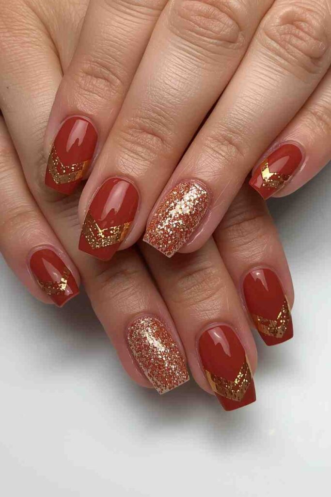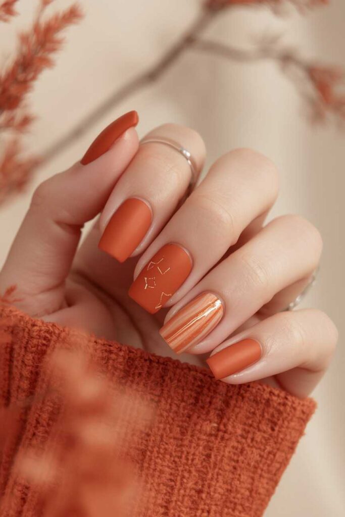 Rust-colored nails combined with gold accents create a chic, luxurious effect. Gold foil, glitter, or stripes add sparkle while maintaining a cozy fall vibe. This manicure is ideal for those who want a stylish yet seasonal statement on their nails.
