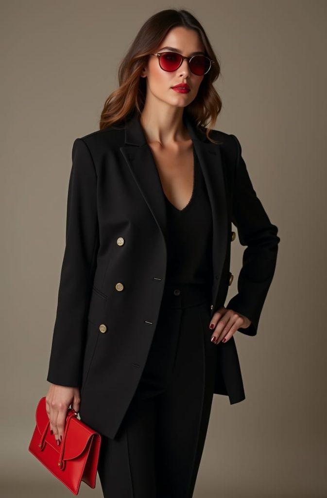 An all-black outfit becomes instantly Valentine-ready with the addition of red accessories. This look is sleek, modern, and perfect for those who prefer subtle romance over pastels.