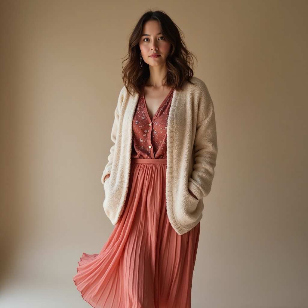 A cozy cardigan layered over a flowy skirt creates a soft, romantic outfit perfect for Valentine’s Day. This combination feels warm and comfortable while still looking feminine and elegant. The movement of the skirt adds charm, while the cardigan keeps things relaxed and practical for all-day wear.