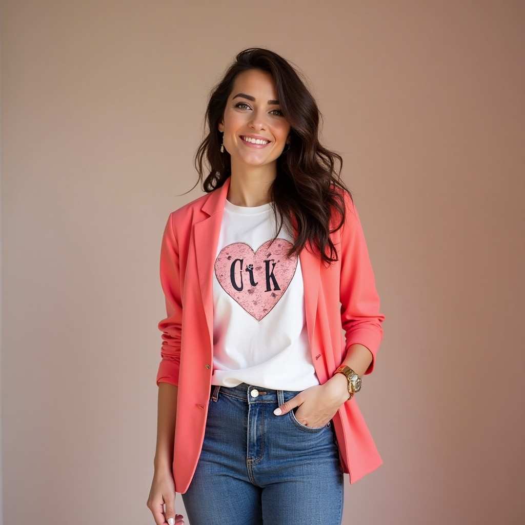 A graphic tee styled with a romantic blazer or cardigan adds a fun twist to Valentine’s Day dressing. This look is ideal for casual plans or low-key celebrations. The mix of playful and polished elements keeps the outfit interesting and modern.