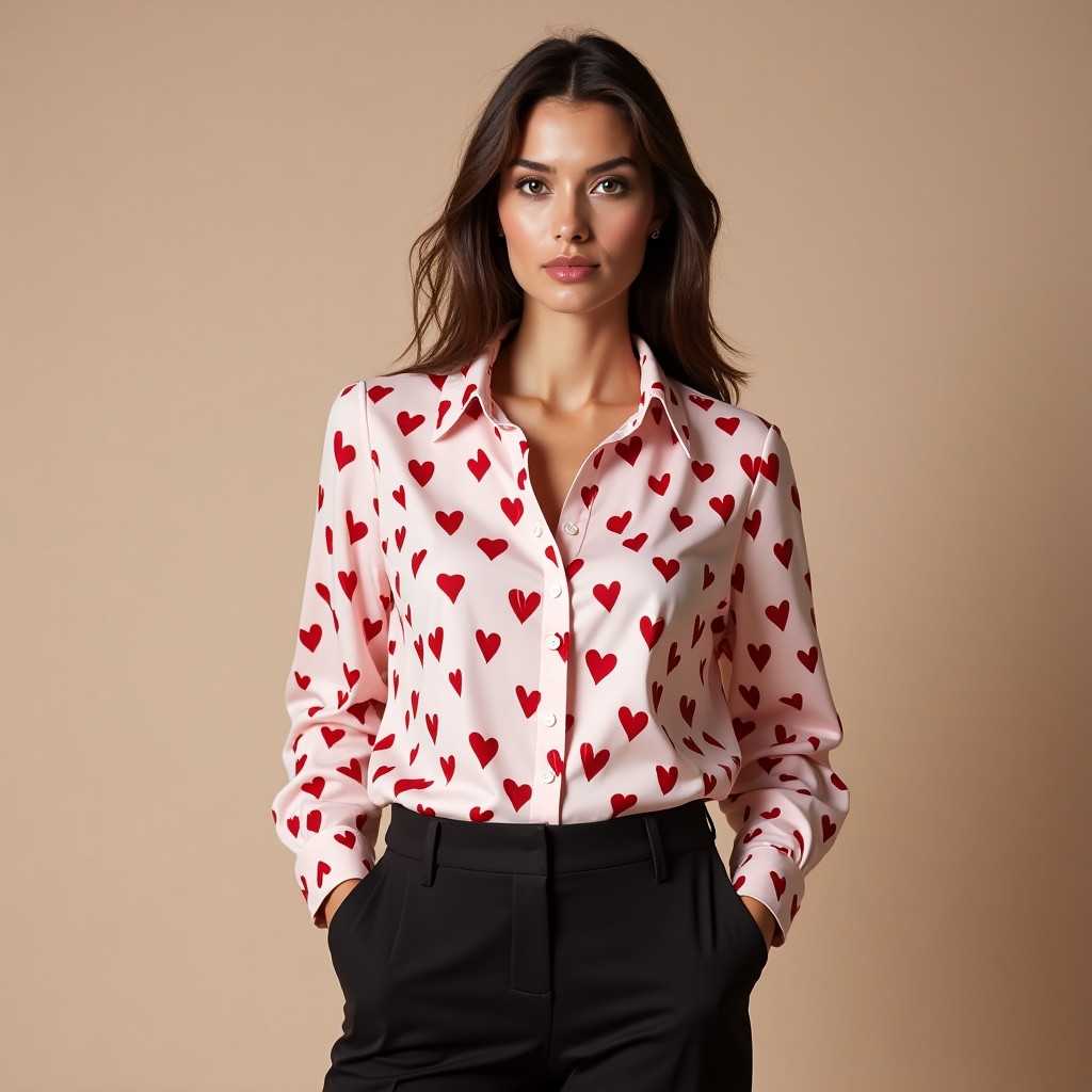 A heart-print blouse is a fun and playful way to embrace Valentine’s Day fashion without going over the top. When paired with tailored trousers, the look becomes chic and wearable for both casual and semi-formal plans.