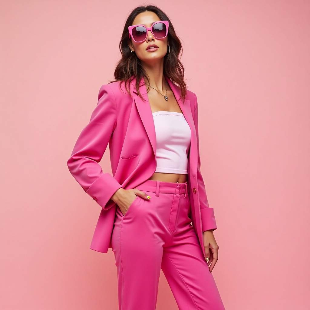 Combine a blush top with deeper pink trousers, white sneakers, and a matching bag.