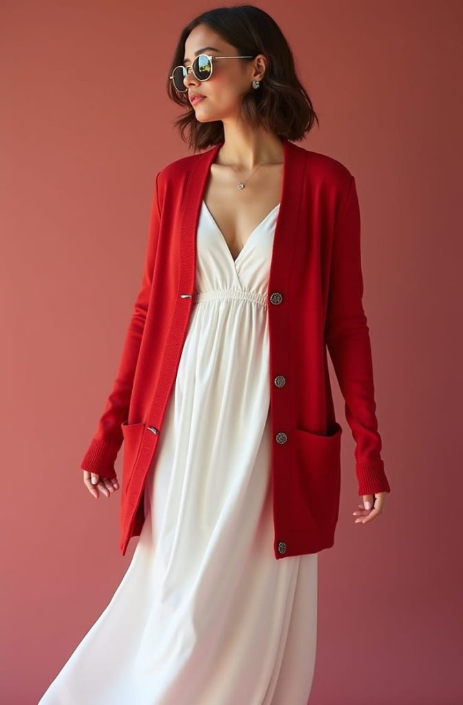 Layering a red cardigan over a white dress creates a fresh and festive Valentine’s Day look. The contrast is eye-catching yet soft, making it ideal for daytime celebrations. This outfit feels light, comfortable, and stylish without requiring much effort.