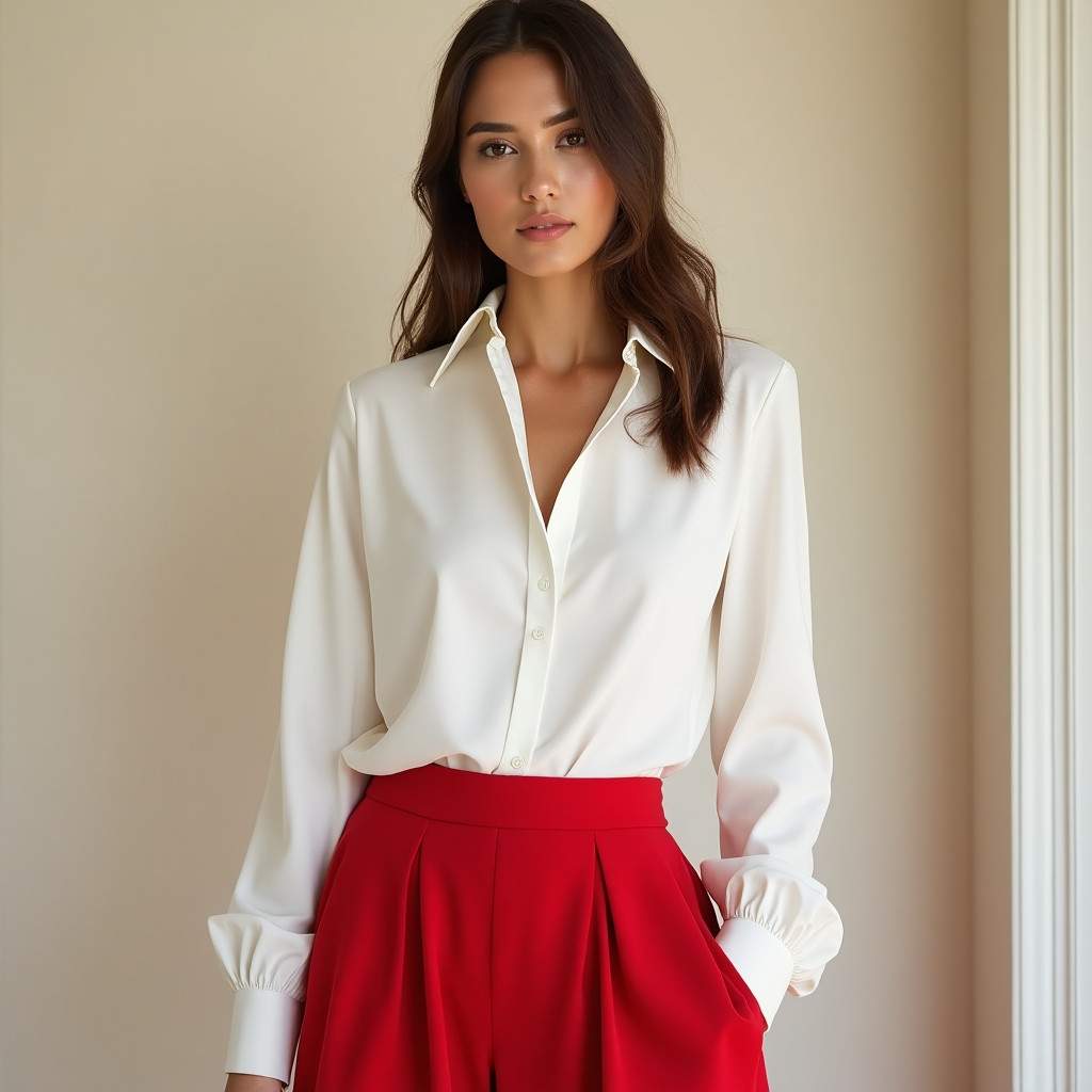A crisp white blouse paired with a red skirt offers a beautiful contrast that feels fresh and romantic. This outfit is easy to dress up or down, making it incredibly versatile. The clean white balances the bold red, creating a polished yet charming look.