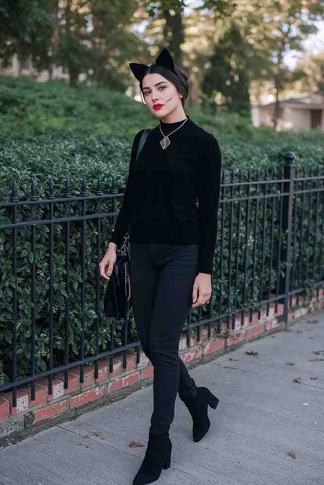 The black cat costume is a timeless Halloween go-to. All you need is an all-black outfit, a pair of cat ears, and a little eyeliner to draw a cute nose and whiskers. It’s chic, effortless, and perfect for any age.