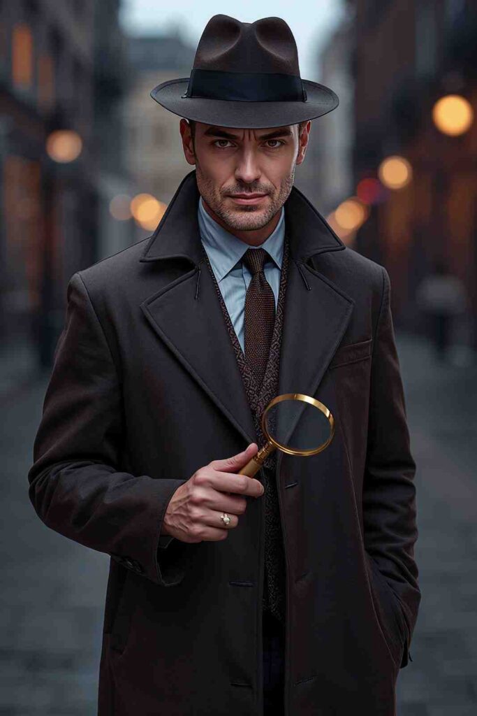 Trench coat, magnifying glass, and maybe a fedora — the detective look is effortlessly cool.