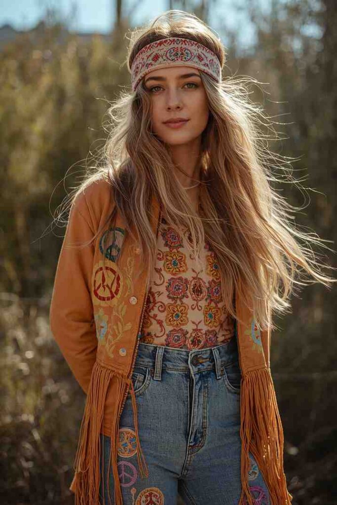 Flared jeans, fringe, peace signs, and a boho headband — easy retro vibes.