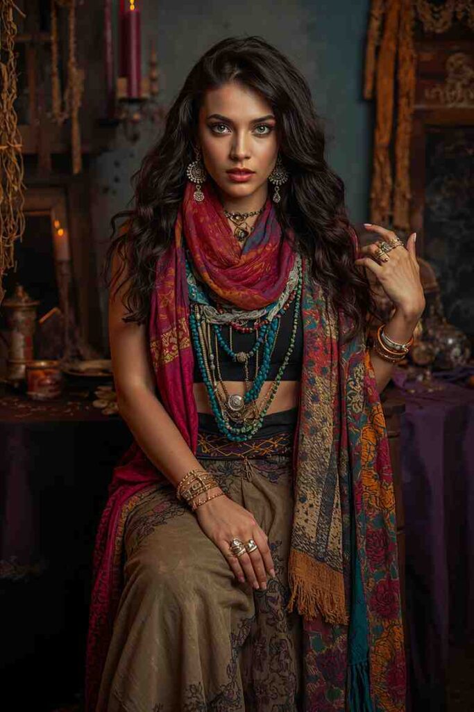 Layer scarves, jewelry, and flowy skirts for a mystical fortune teller look.