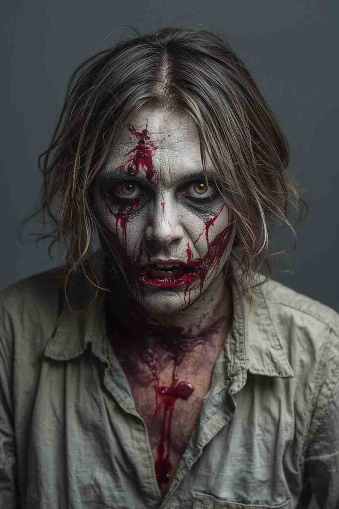 Ripped clothes, messy hair, pale makeup, and dark eye circles — that’s all you need. A little fake blood goes a long way too.