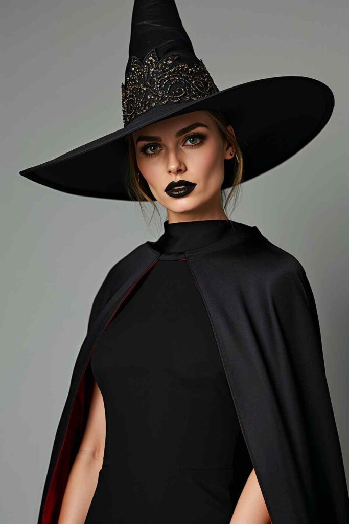 A black dress, pointed hat, and dark lipstick are all you need to become a chic witch. Layer with a cape or shawl for extra flair.