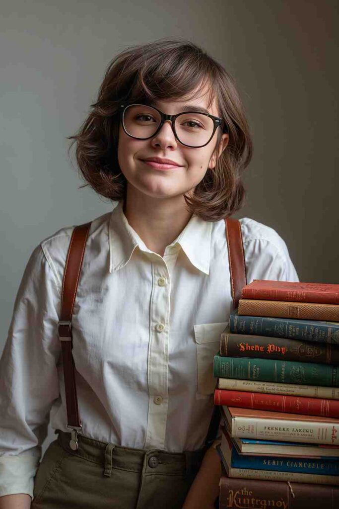 Suspenders, glasses, button-down shirt, and a stack of books — classic and cute.
