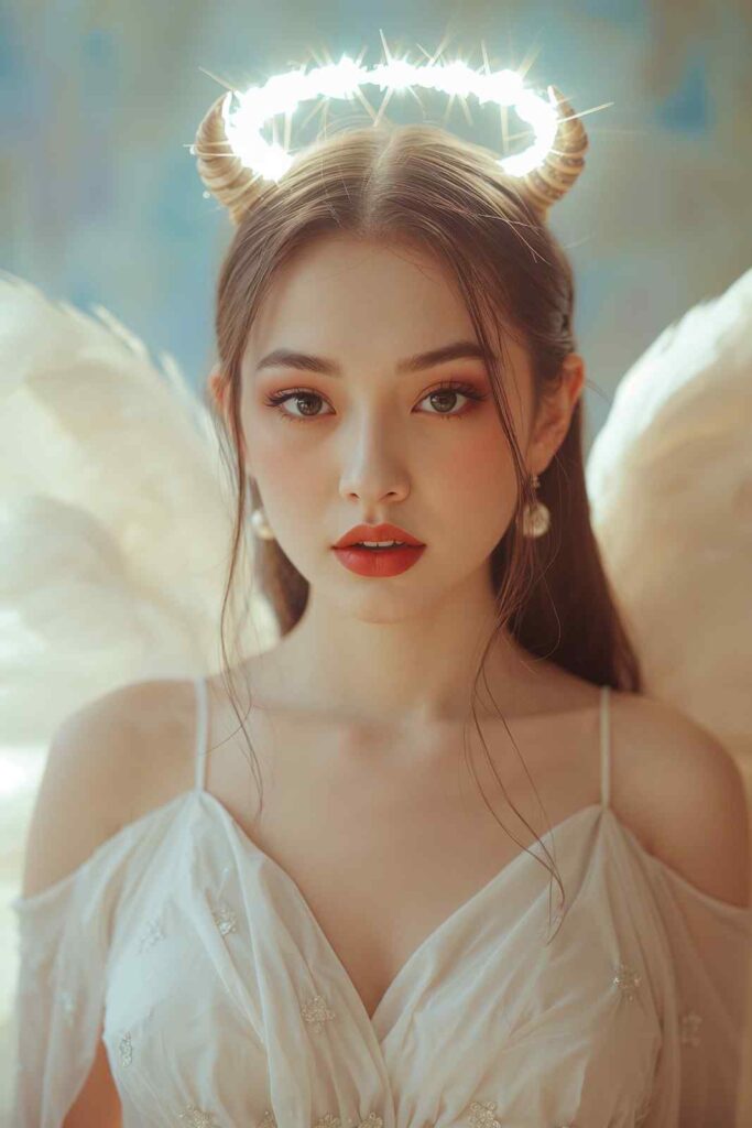 Balance out the devil look with an angel costume — white outfit, halo headband, and soft makeup.