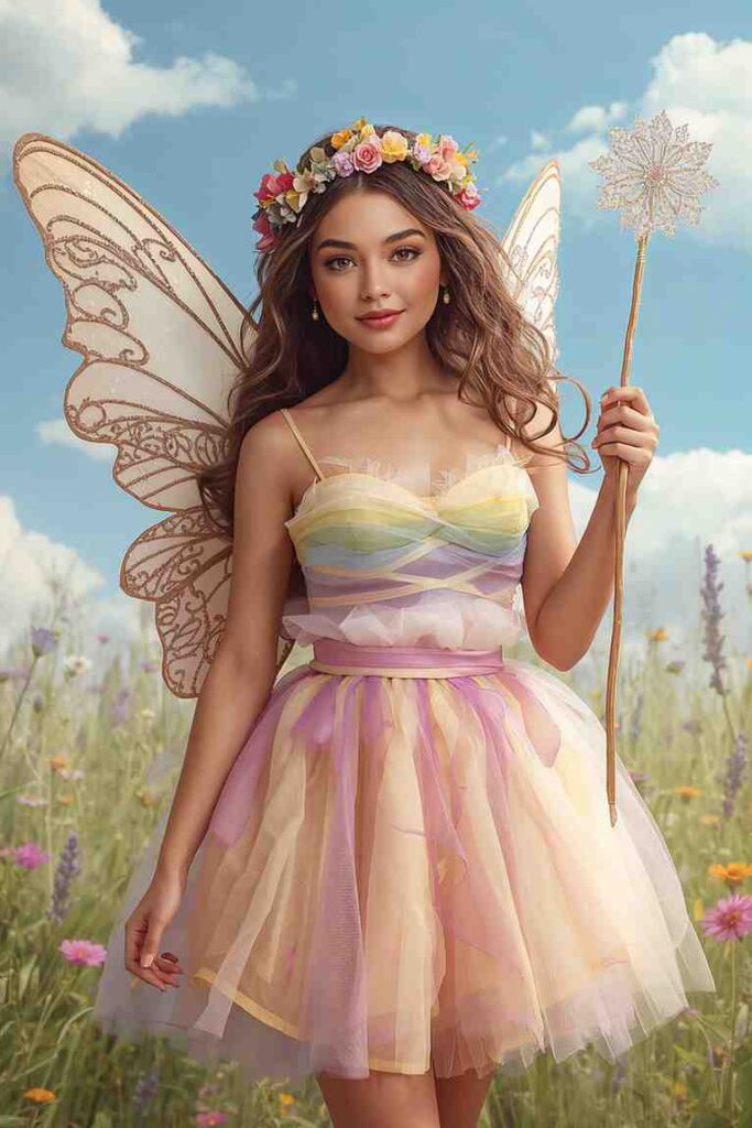 Pastel dress, wings, glitter, and floral accessories — the fairy costume is dreamy and enchanting.
