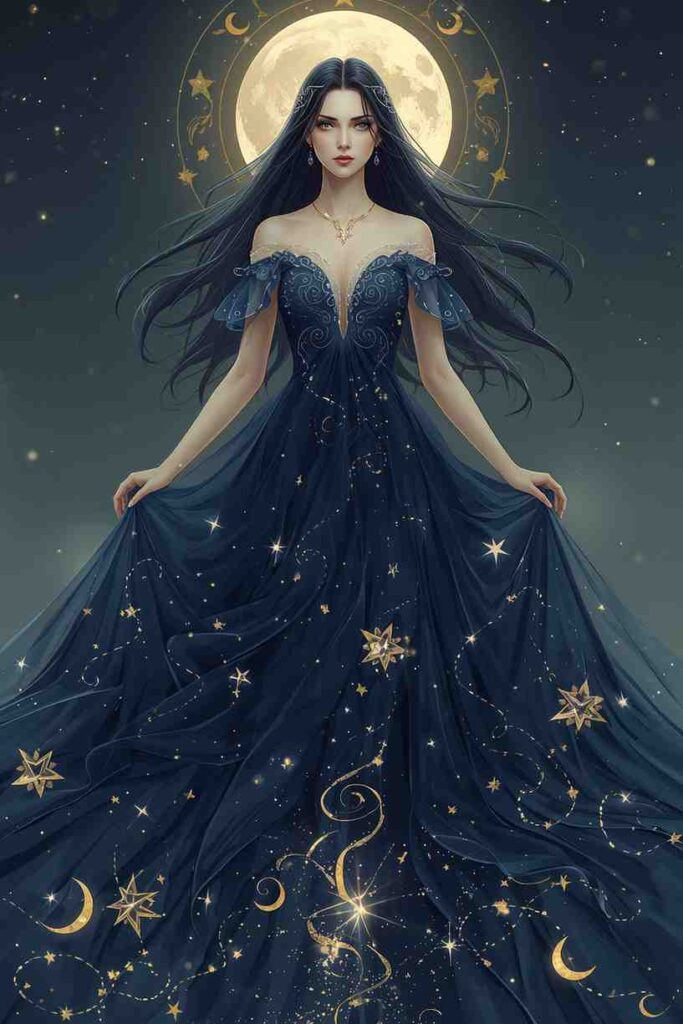 A flowing navy or black gown adorned with stars and moons gives a celestial, mystical appearance.