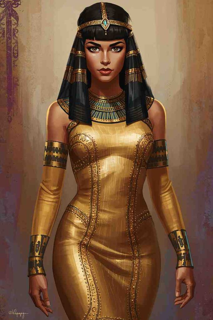 A structured gold dress or column gown with beaded accents channels Cleopatra’s power and elegance.