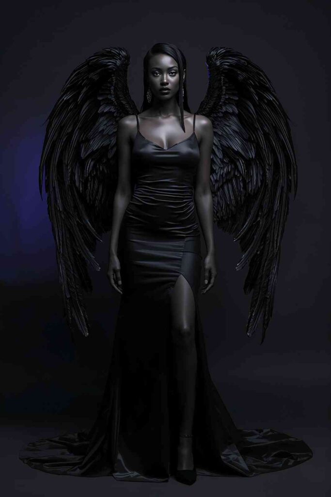 Black feathered wings with a chic black gown make for a haunting yet beautiful Halloween outfit.