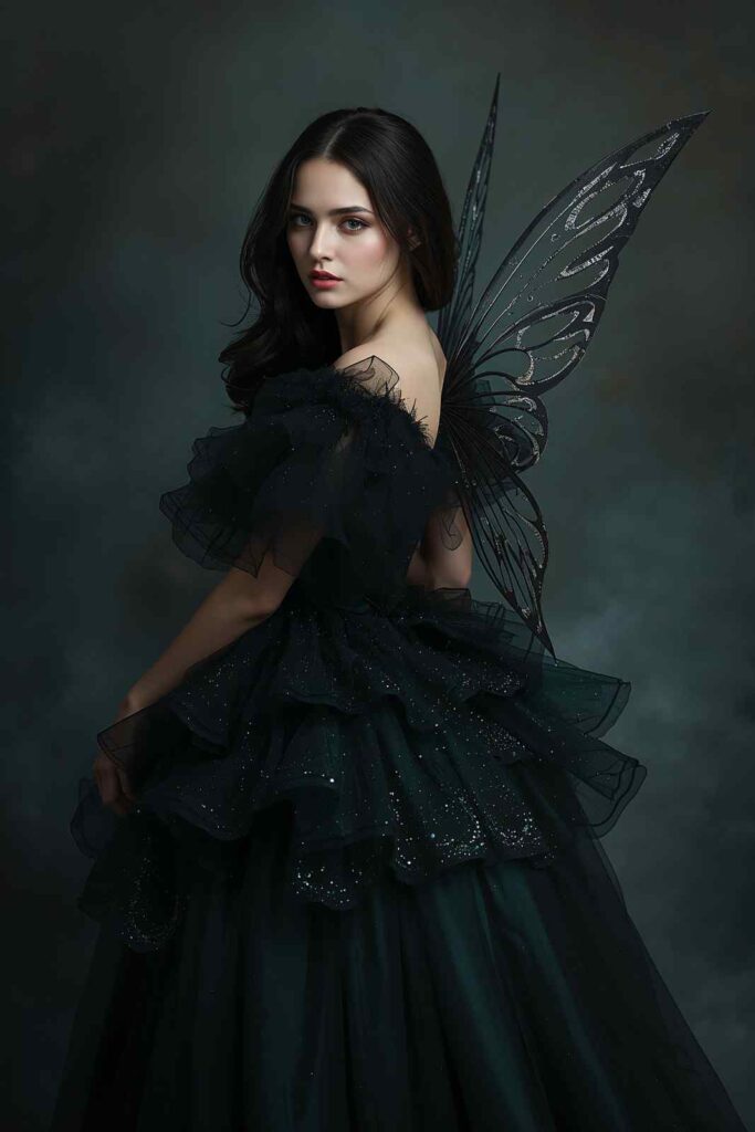 A black or deep emerald tulle gown with delicate wings creates a dark yet dreamy vibe. Add subtle sparkle to enhance the magical feel.