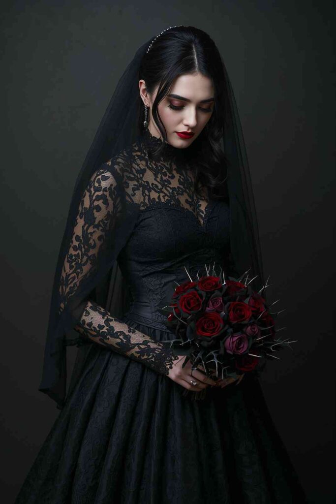 A black lace gown, veil, and dark roses in your bouquet create a hauntingly romantic bride aesthetic.