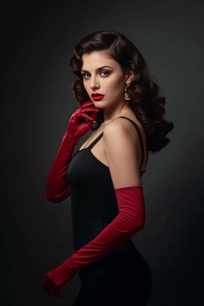 Think fitted black dress, red lipstick, gloves, and vintage curls—like a glamorous villain from a noir film.
