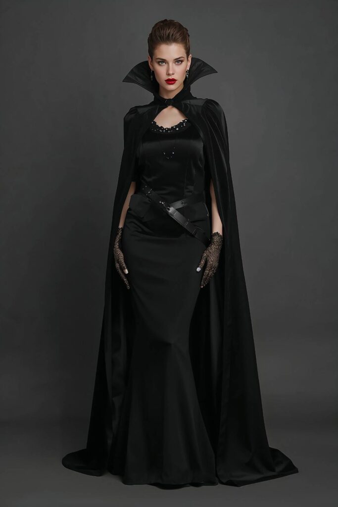 Channel a timeless, seductive vibe with a fitted black gown, dramatic cape, and dark red lips. A structured silhouette adds refinement, while lace gloves and vintage jewelry complete the vampire queen or count aesthetic.