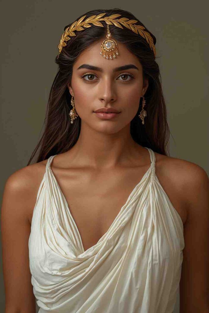 A flowing white gown, gold laurel headpiece, and statement jewelry bring the Greek goddess aesthetic to life.