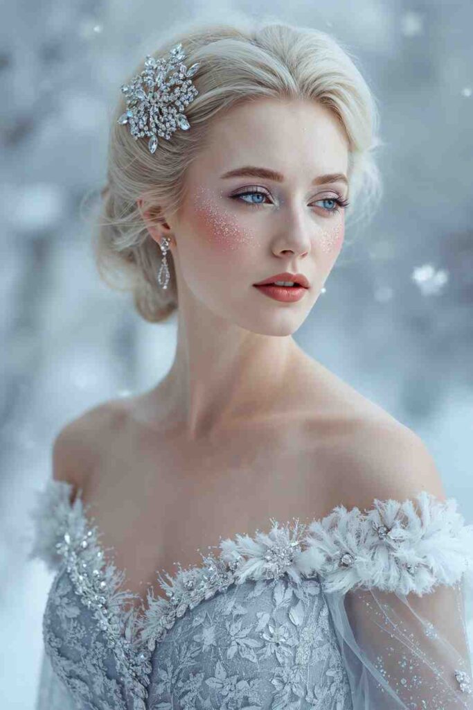 A sparkling silver or icy blue gown with rhinestone accessories and frosted makeup creates a striking, ethereal look.