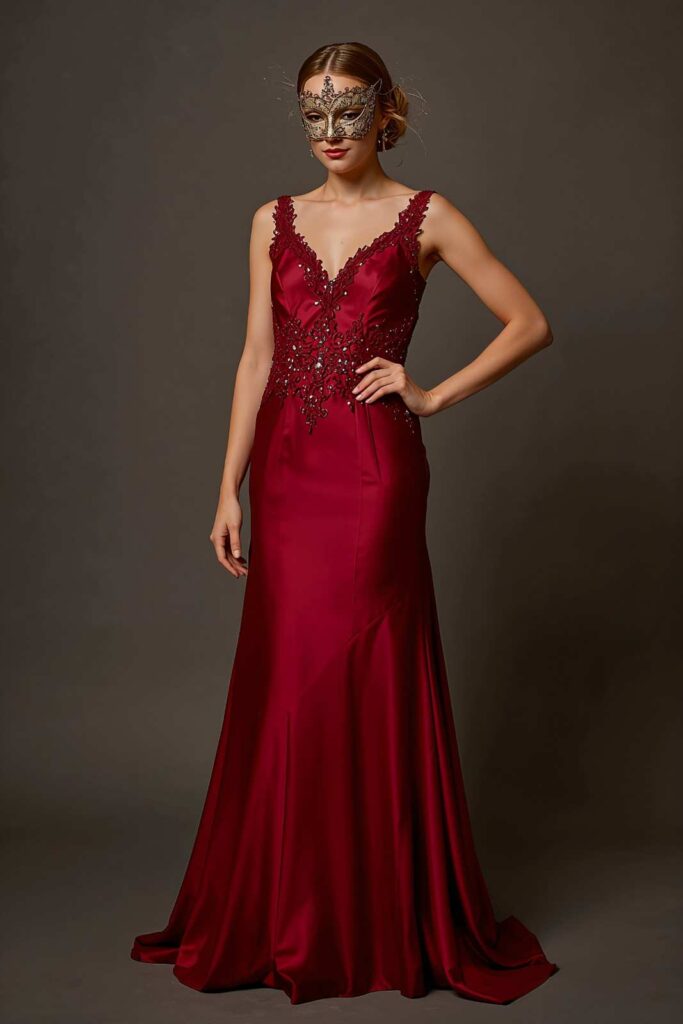 A floor-length gown with a jeweled or lace mask exudes mystery and sophistication. Think luxurious fabrics like satin or velvet and ornate detailing.