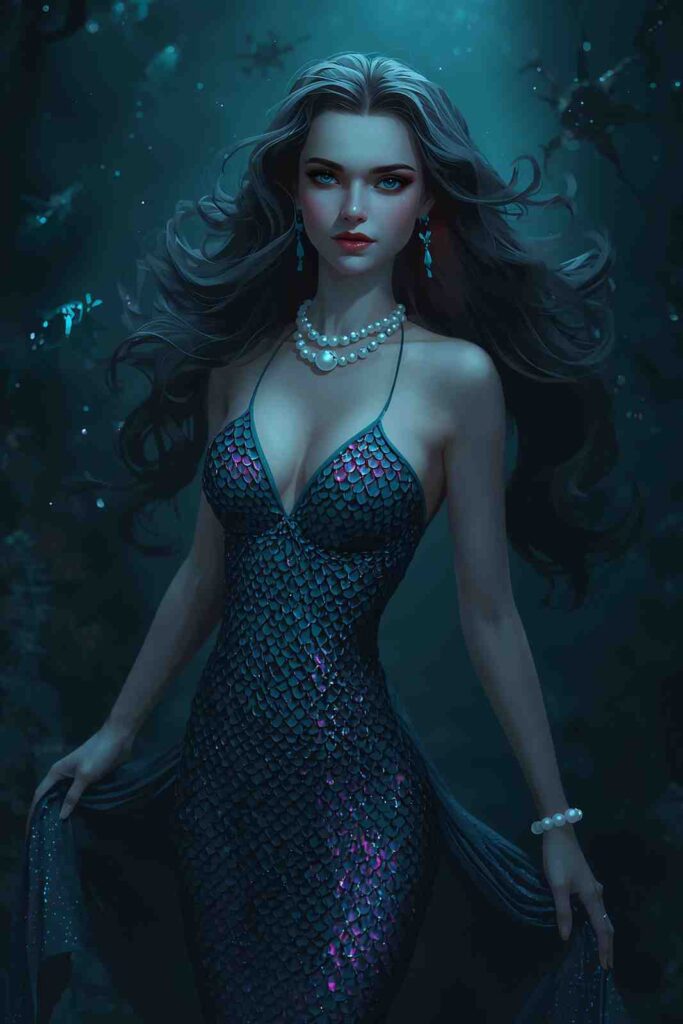 Shimmering scales, fitted gowns, and pearl accessories create a sophisticated mermaid ensemble perfect for adults.