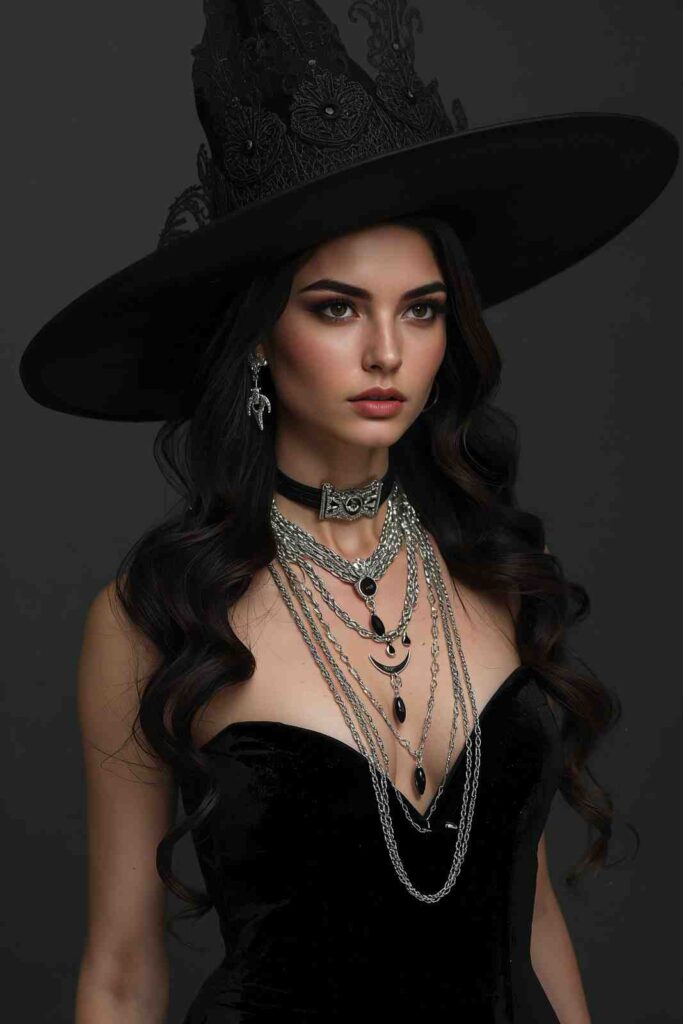 Swap the typical witch costume for a sleek black velvet gown, structured hat, and luxe jewelry. Elegant yet unmistakably witchy.