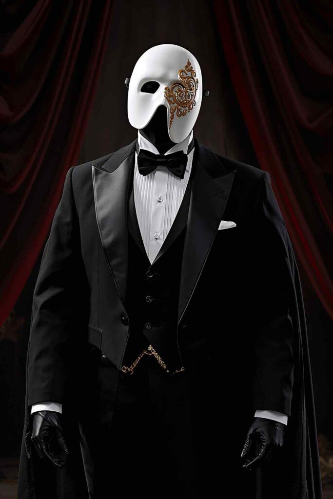 A tuxedo or elegant gown paired with a half-face mask creates a sophisticated and mysterious costume.
