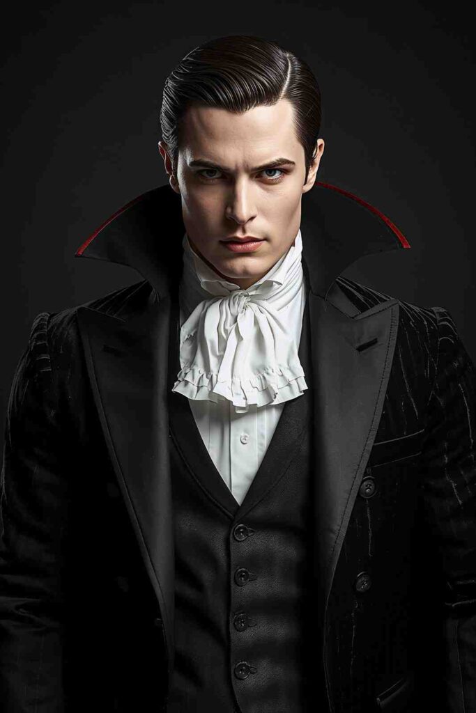 A tailored suit or velvet cloak with a dramatic collar creates a sharp, masculine vampire look that’s both spooky and stylish.