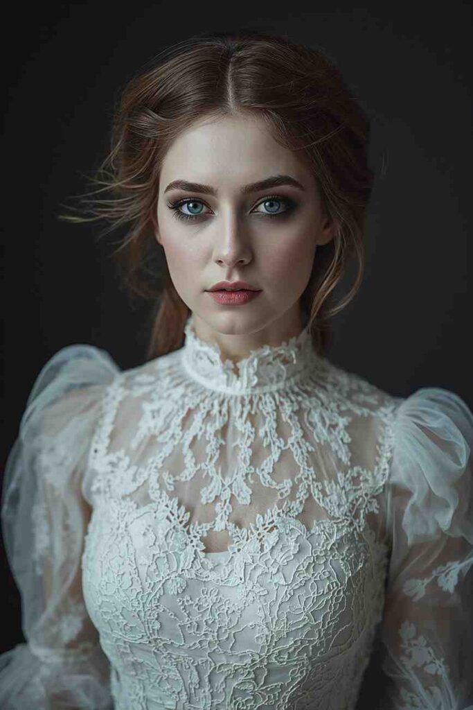 A lace, high-collar Victorian-style gown in white or grey gives an ethereal, ghostly charm. Add pale makeup and smoky eyes for effect.