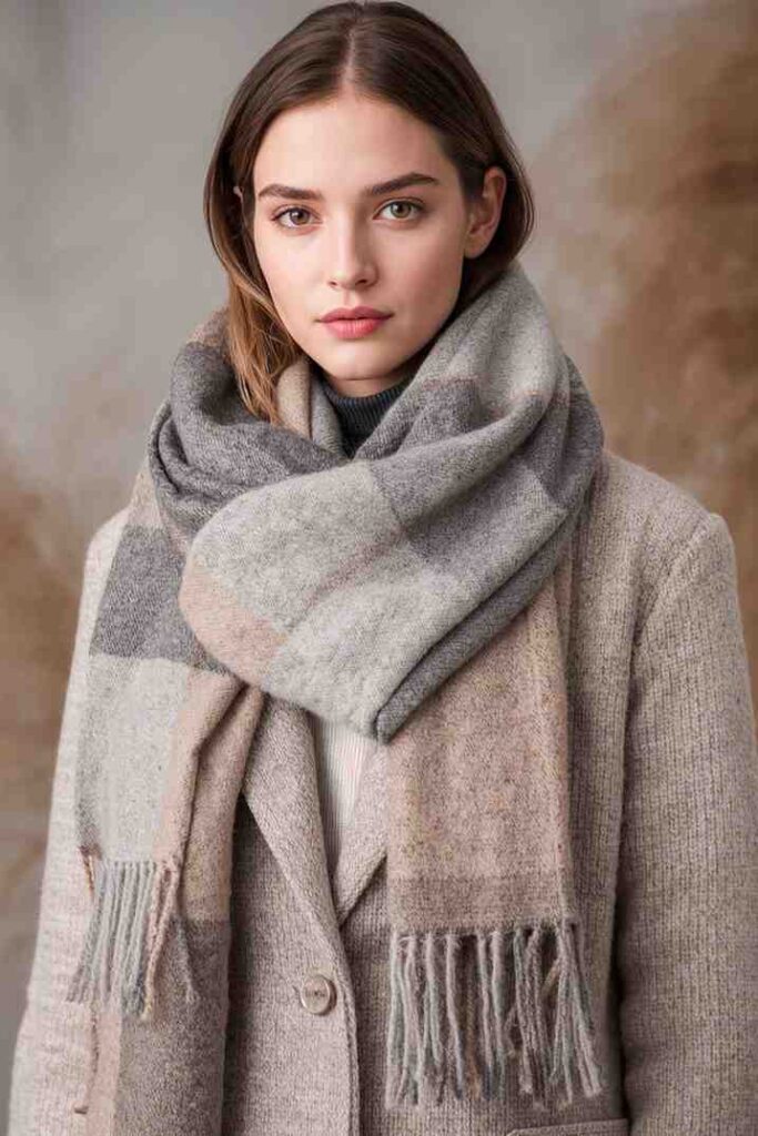 Layering a blanket scarf over neutral coats or sweaters is functional and stylish.