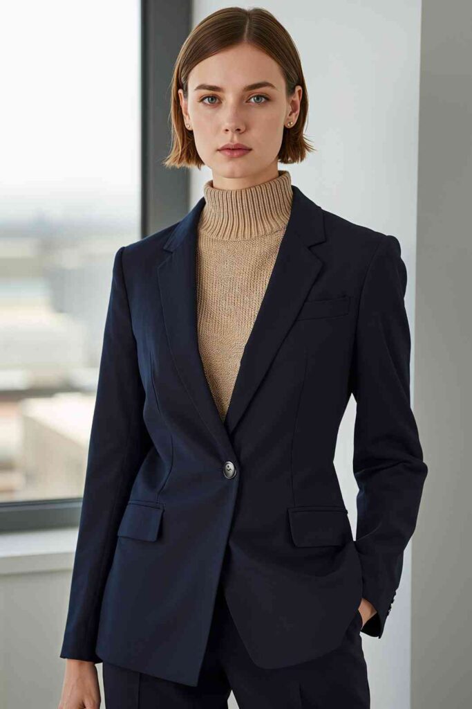 A tailored blazer layered over a knit top is office-ready and stylish.