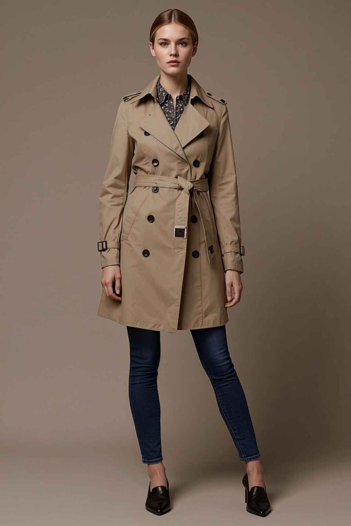 A timeless trench coat paired with slim jeans creates effortless polish for fall.