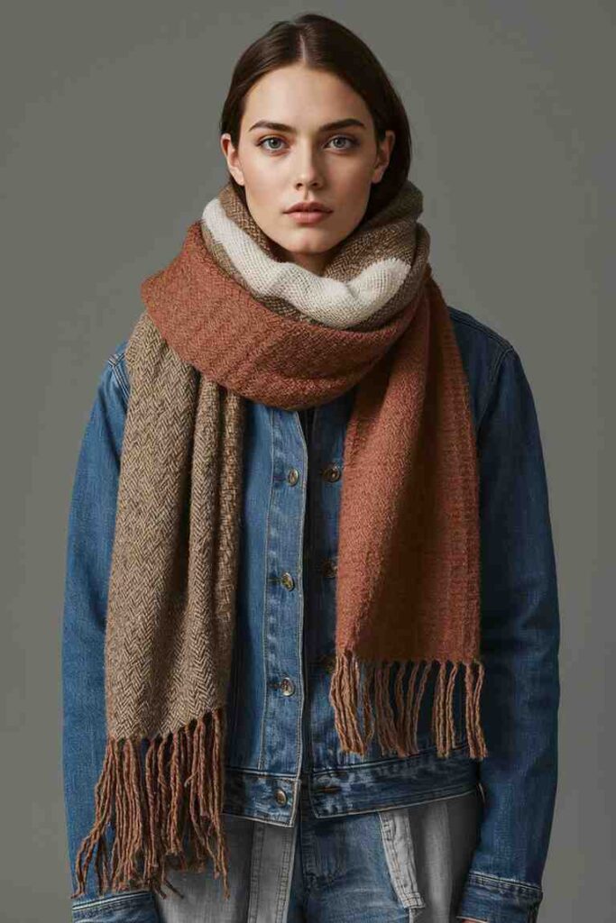 Layering a denim jacket with scarves brings texture and warmth to everyday outfits.
