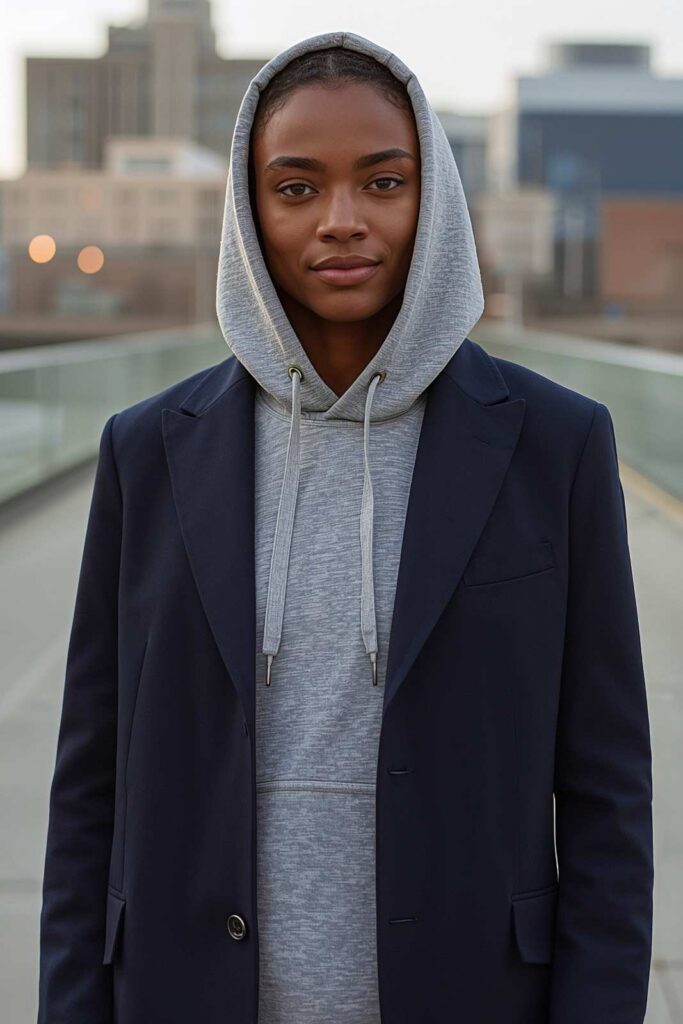 A hoodie worn under a blazer creates the perfect blend of casual and chic.