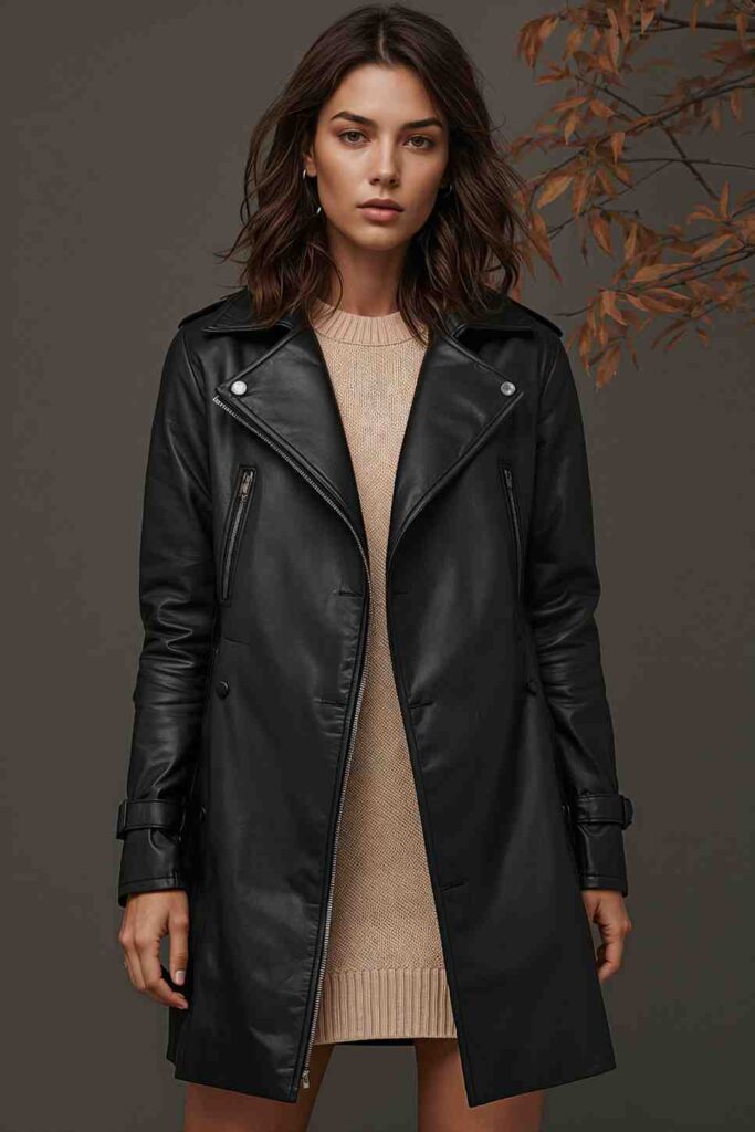 A leather trench coat over a sweater dress brings edgy sophistication to fall layers.
