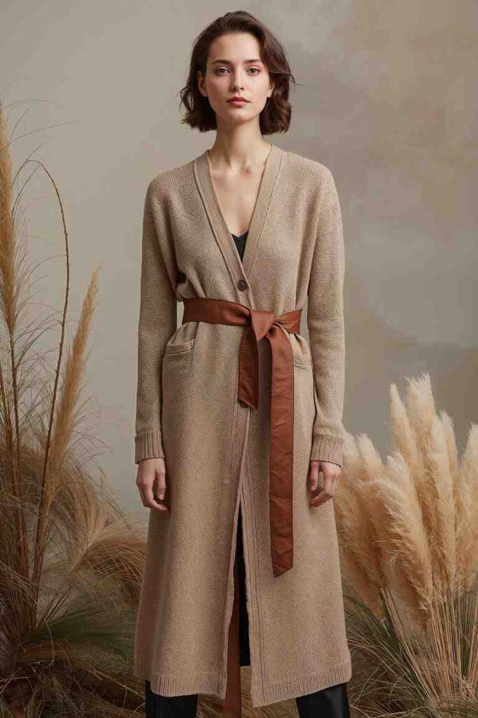 A long cardigan cinched at the waist creates structure and adds elegance to casual layers.