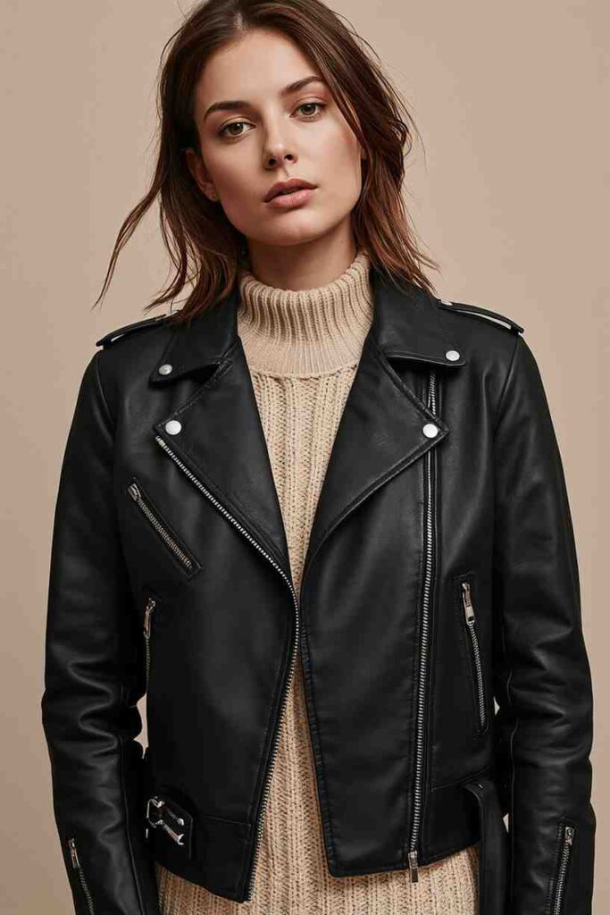 A moto jacket layered over a knit sweater adds subtle edge and chic appeal.