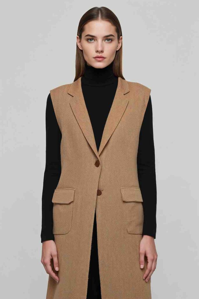 A long vest over a fitted turtleneck adds dimension and effortless sophistication.