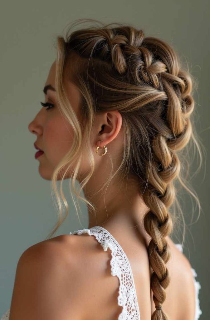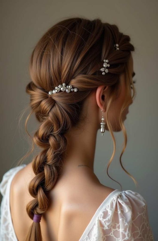 The fishtail braid adds texture and charm, making it stand out without looking too formal. It’s a perfect choice for those who love delicate details and timeless romantic styles.