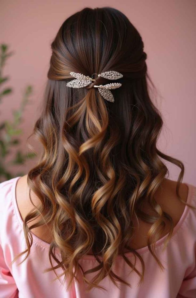 Half-up curls with clips create a romantic and charming hairstyle that’s ideal for Valentine’s Day. This look combines soft, flowing curls with decorative clips that add sparkle or elegance without overpowering the style. The half-up design keeps hair away from the face while allowing natural movement through the lengths.