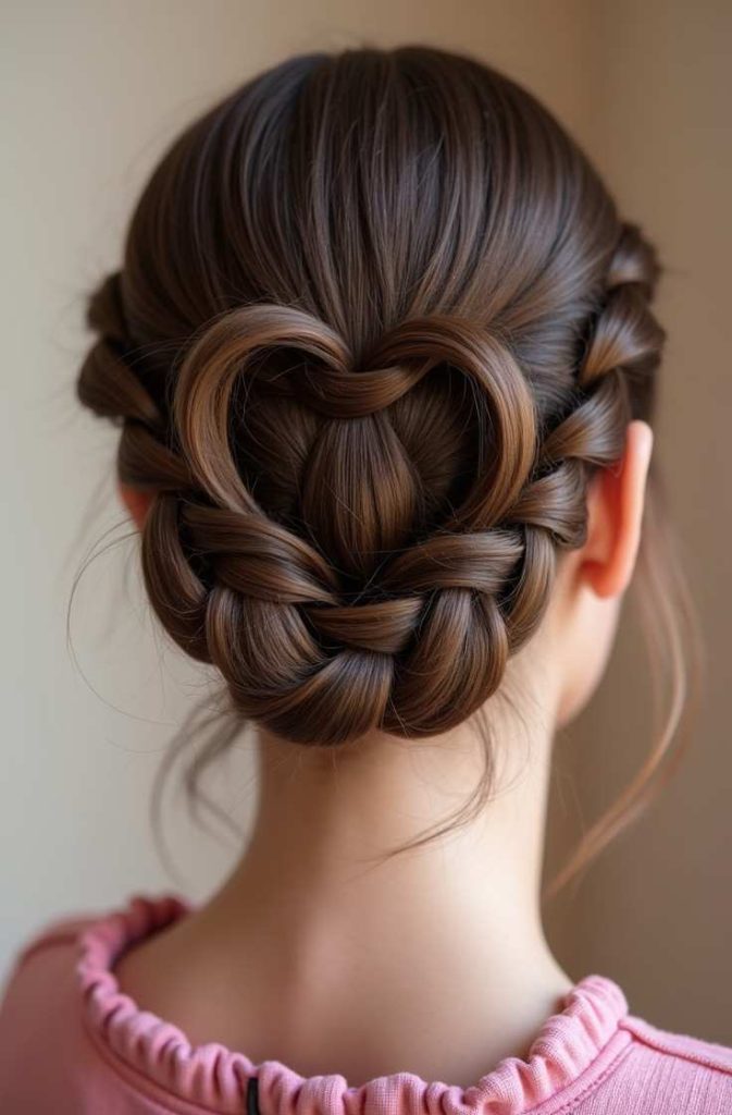 How to style: Create two small braids on each side, shape them into a heart, and secure at the back.