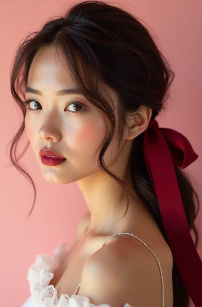 A low ponytail with a ribbon is a sweet and charming hairstyle that captures the romantic spirit of Valentine’s Day. This look combines the simplicity of a low ponytail with the delicate elegance of a ribbon, creating a soft and feminine finish.